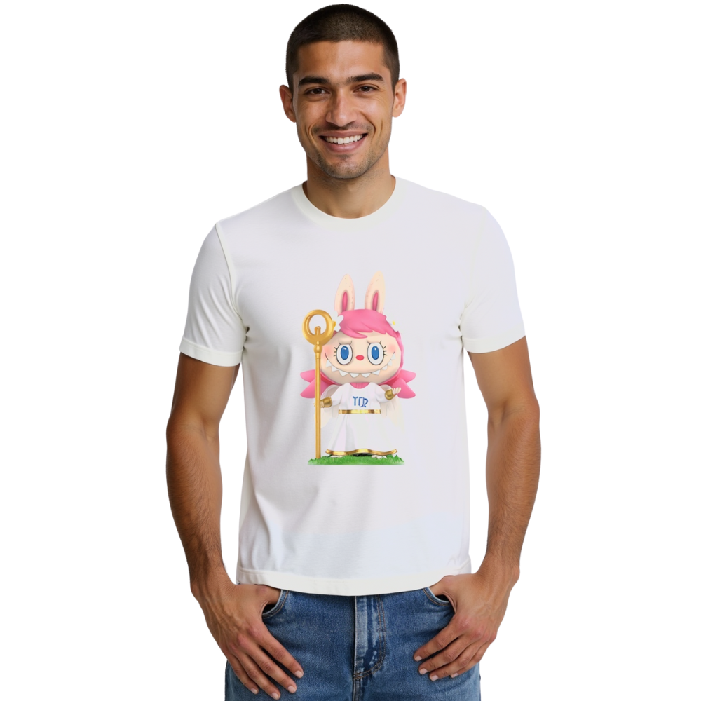 The Labubu Virgo Bunny Wearing Robe Graphic Tee blends astrological symbolism with imaginative character design. This character-forward t-shirt features a celestial bunny dressed in a flowing robe, gold-trimmed wings, and a staff—positioned with precision and symbolic calm. The figure’s serene expression, flower crown, and pink hair add charm to this Virgo-inspired illustration.