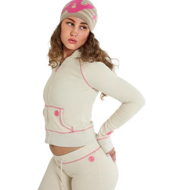 Whether stepping outside or meeting friends the casual ribbed set helps you stay prepared. It pairs with flats or slip-on shoes.