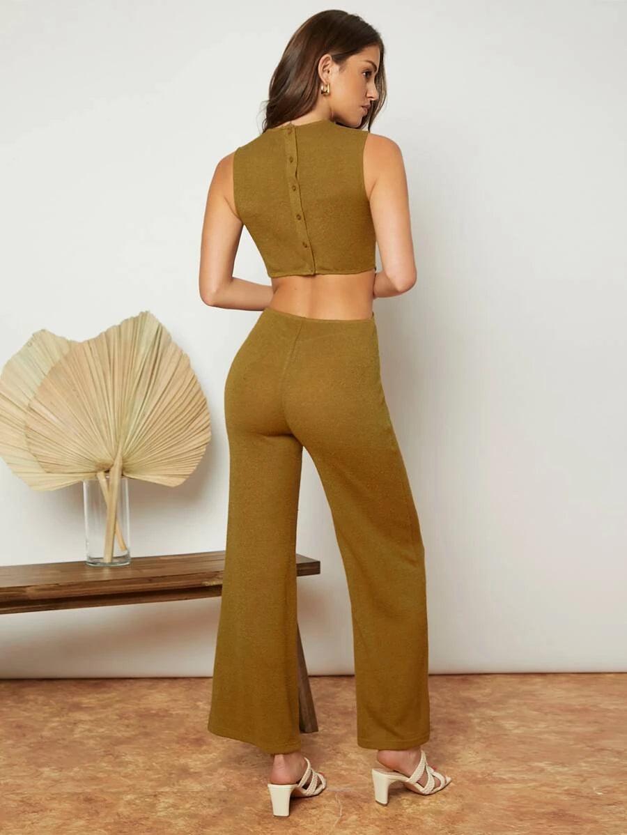 Step out in style with this one-of-a-kind Waist Button Detail Flare Leg Jumpsuit, featuring a stylish button-back detail, elegant cut-out, and exquisite brown hue. From its timeless silhouette to its luxurious flare leg cut, this must-have jumpsuit is the perfect choice for any sophisticated individual seeking effortless elegance.