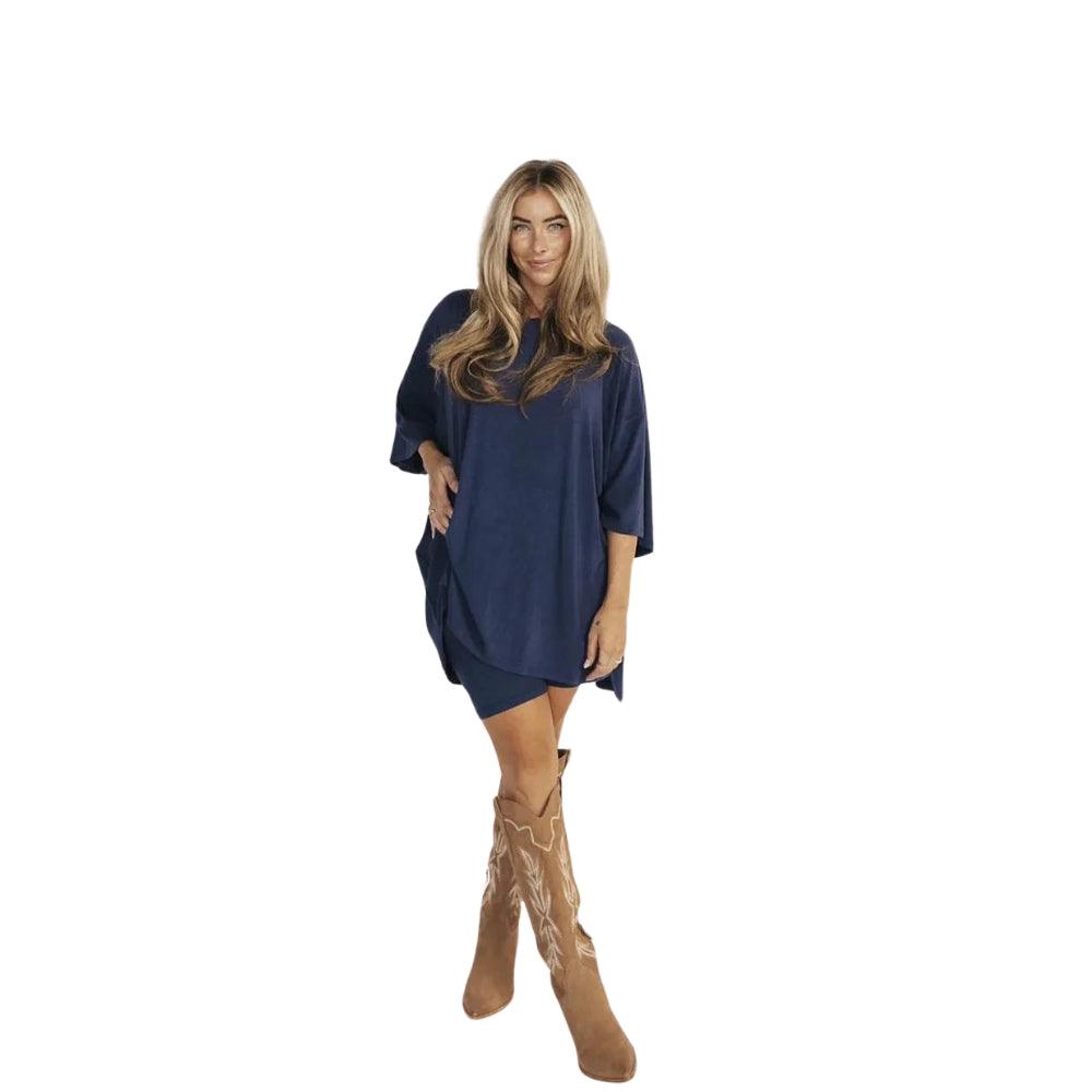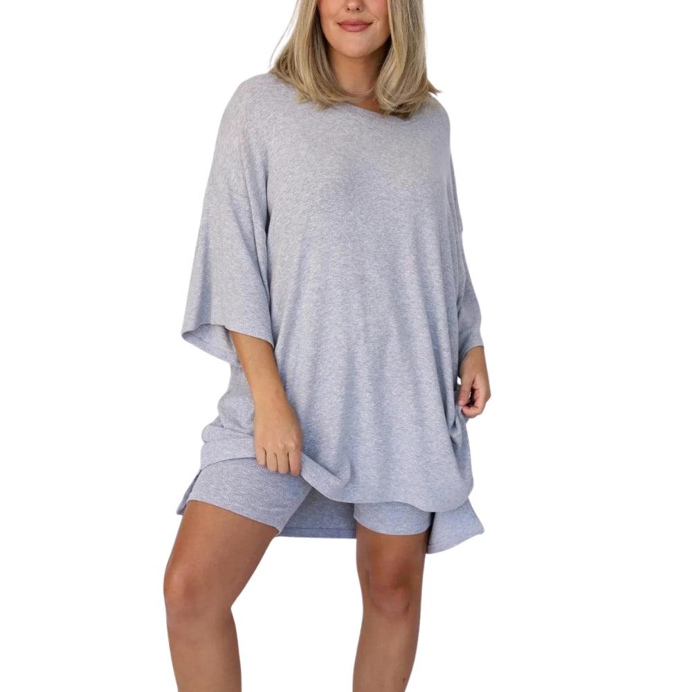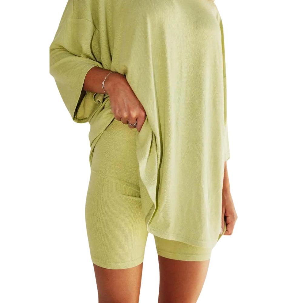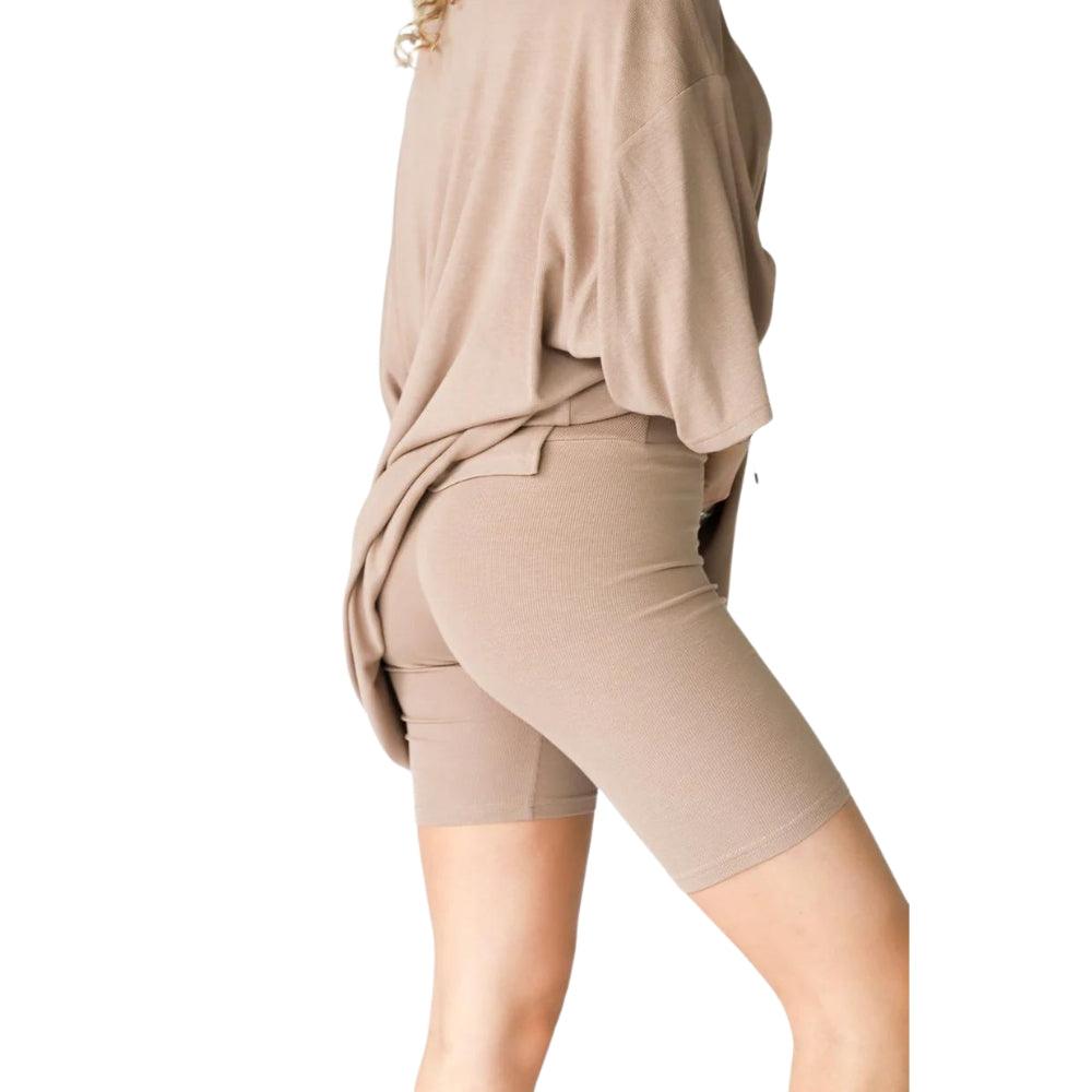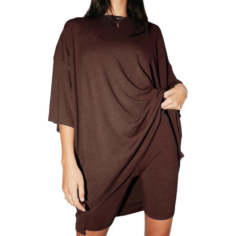 The oversized top adds a laid-back silhouette, while the biker shorts provide a close fit with a wide waistband that lays flat without digging in. Designed with movement in mind, this matching lounge set works well as casual loungewear for women seeking comfort that translates to real-life wear.