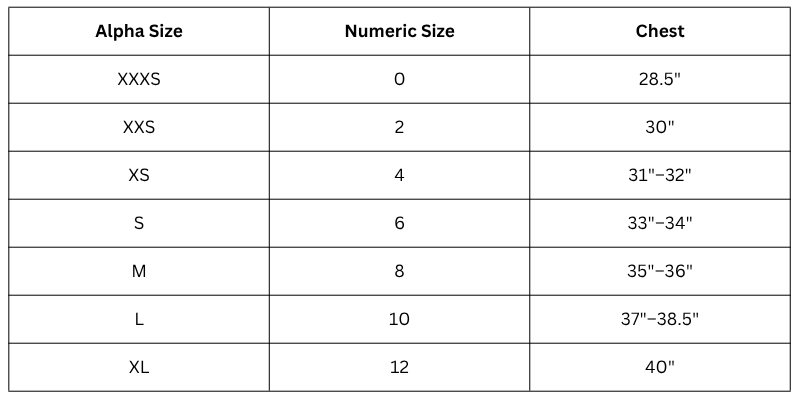Sizes: XXXS, XXS, XS, S, M, L, XL