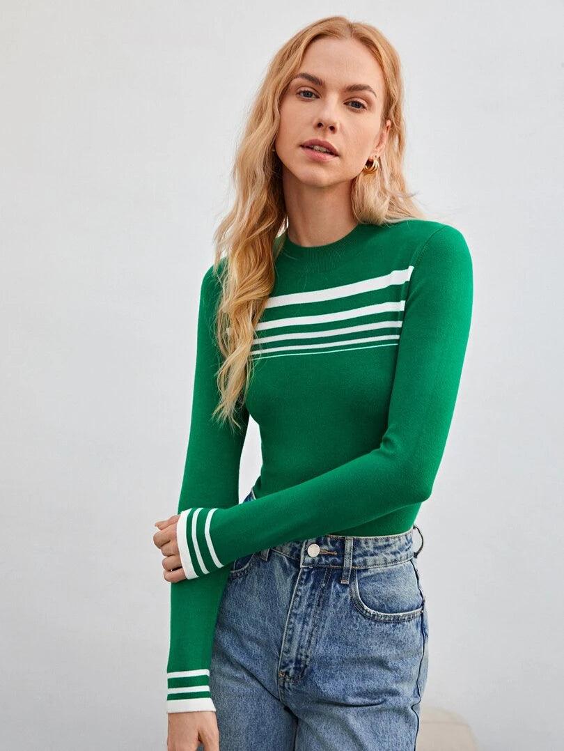 Wool Mix Fine Knit Bodysuit has a green striped pattern and the rib-knit texture adds a touch of sophistication, while the pocket detail gives it a casual vibe. Long sleeves make it perfect for cooler weather, and the natural waistline flatters any body type. This versatile bodysuit can be dressed up or down, making it a must-have for any wardrobe.