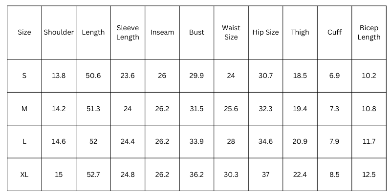 Size Chart (inches):
