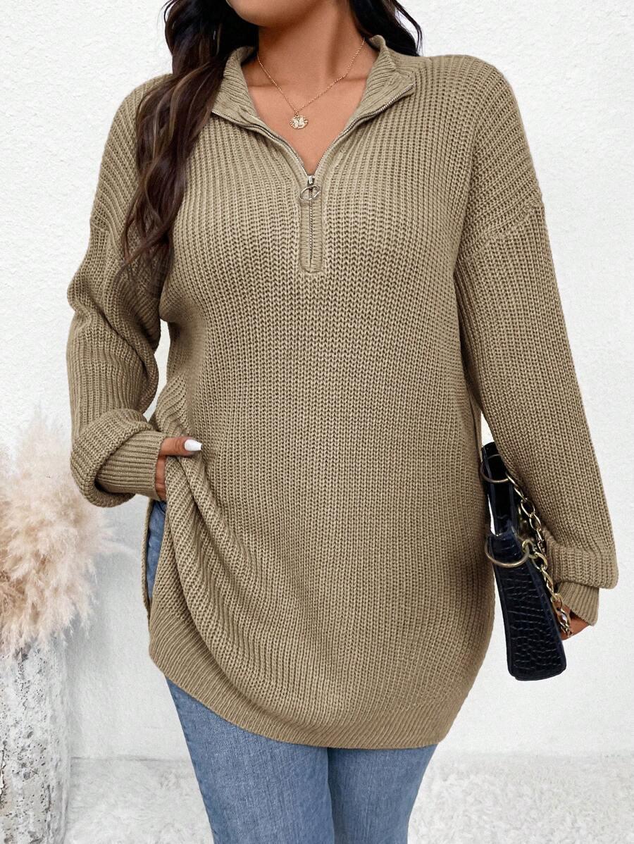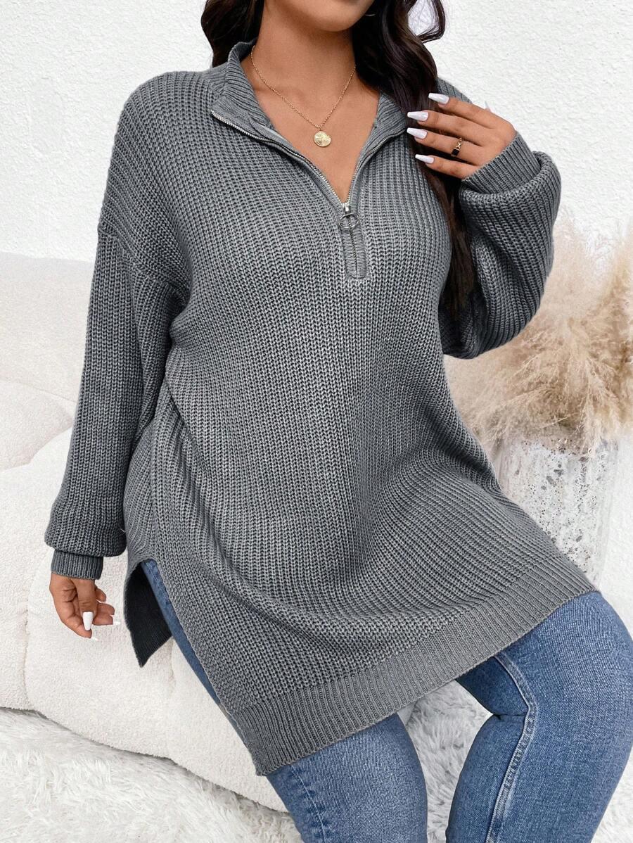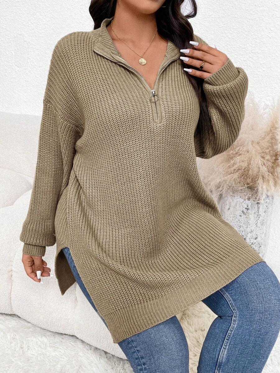 Embrace comfort with this modern Zipper Front Split Hem Sweater. The split hem design adds a touch of style, while the ribbed knit fabric ensures a snug and flattering fit. Perfect for a relaxed weekend outing or a casual day at the office. This sweater's contemporary design features a stylish zipper detail and a playful split hem, making it an ideal choice for the fashion-forward individual. It's long sleeves and cozy knit is perfect for staying warm in style.