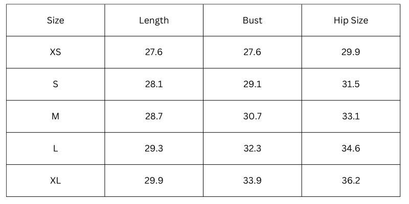 Size Chart (inches):